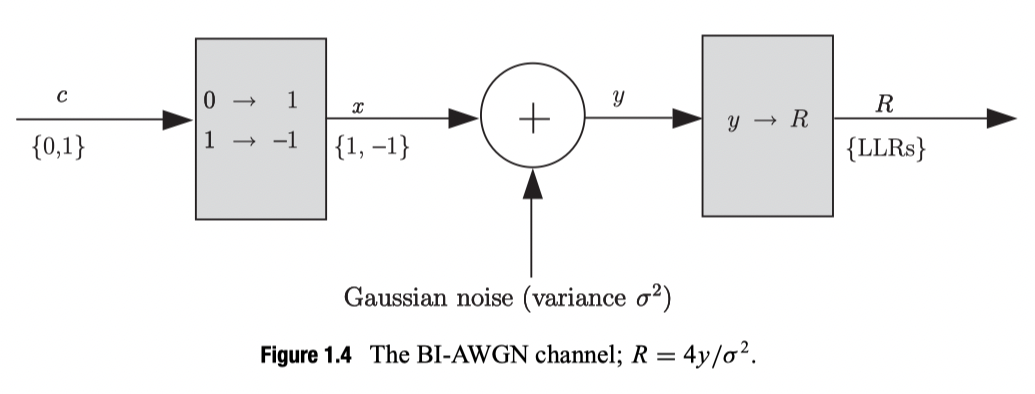 Binary-input additive white Gaussian noise (BI-AWGN)信道可以用方程描述如下: