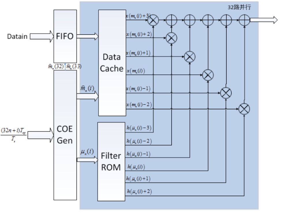 假设当前采样率为5Gsps,在200MHz及以下时钟频率下,要32路并行运算,可以将公式修改为 $$ y(32n+i) = \sum_{m=-3}^{+2}h_T(\mu_n(i)+m)x(m_n(i)-m) $$ 式中$n$为时刻值,$i$为并行的路数的序数。$m_{n}(i)=\left\lfloor\frac{(32 n+i) T_{s p}}{T_{s}}\right\rfloor$,$\mu_{n}(i)=\frac{(32 n+i) T_{s p}}{T_{s}}-m_{n}(i)$。
