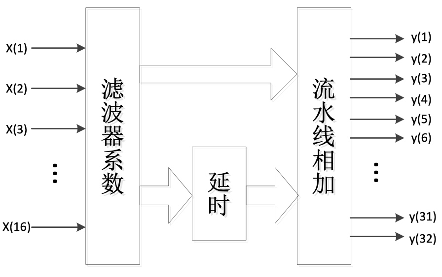 由于滤波器参数是对称的,所以其实$H_0X_0$和$H_{31}X_0$是一样的,因此只需要一半的滤波器系数即可,而且由于矩阵中有一半的运算是通过延迟32个时钟(这里32路并行,相当于只需要延迟一个时钟周期即可)实现的,所以可以将结果分成两部分,一部分先延时,再输入流水相加模块,另一部分直接输入流水相加模块,进行流水线相加,实现整个低通滤波的过程,其具体实现框图如图所示: